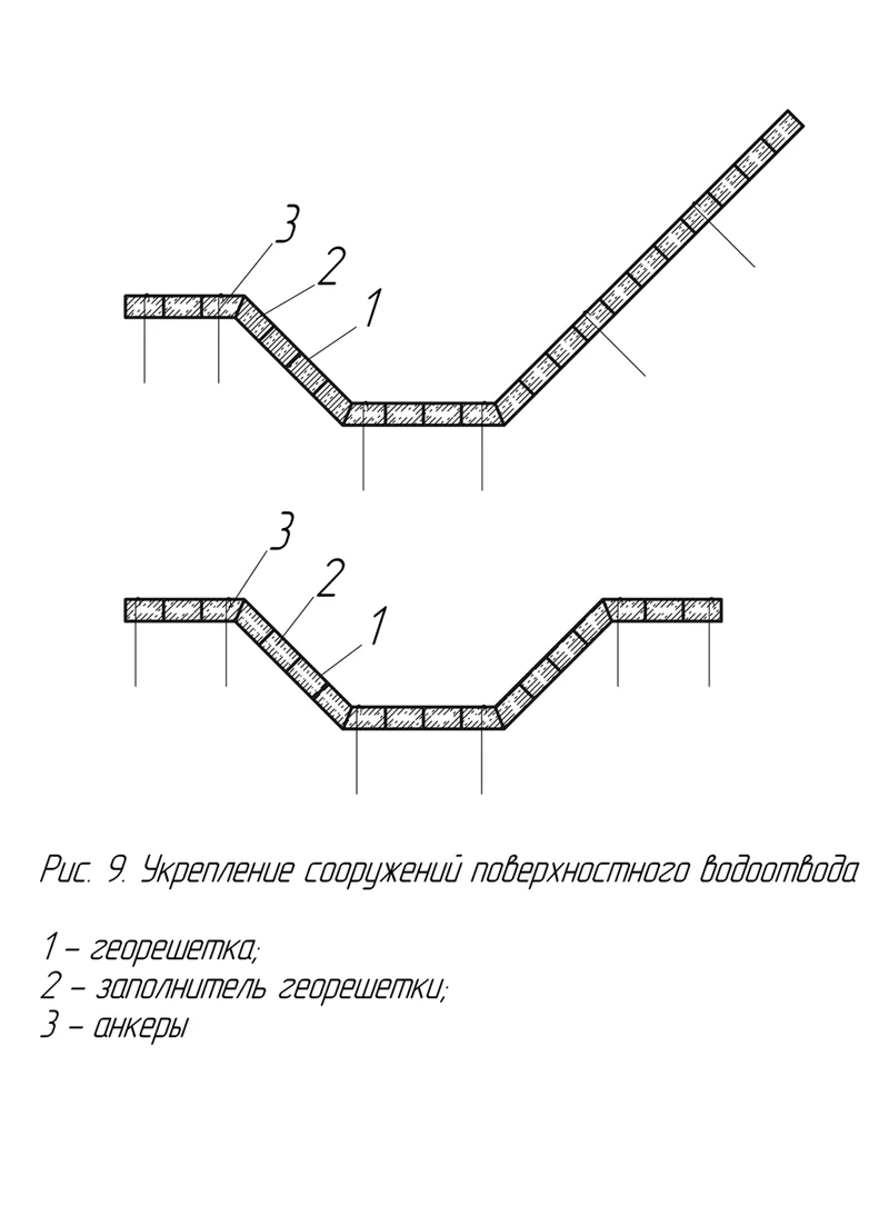 Укрепление кюветов, как правило, сочетают с укреплением откосов, создавая единую систему защиты от эрозии. Края георешеток выводят за пределы бровок и надежно закрепляют.